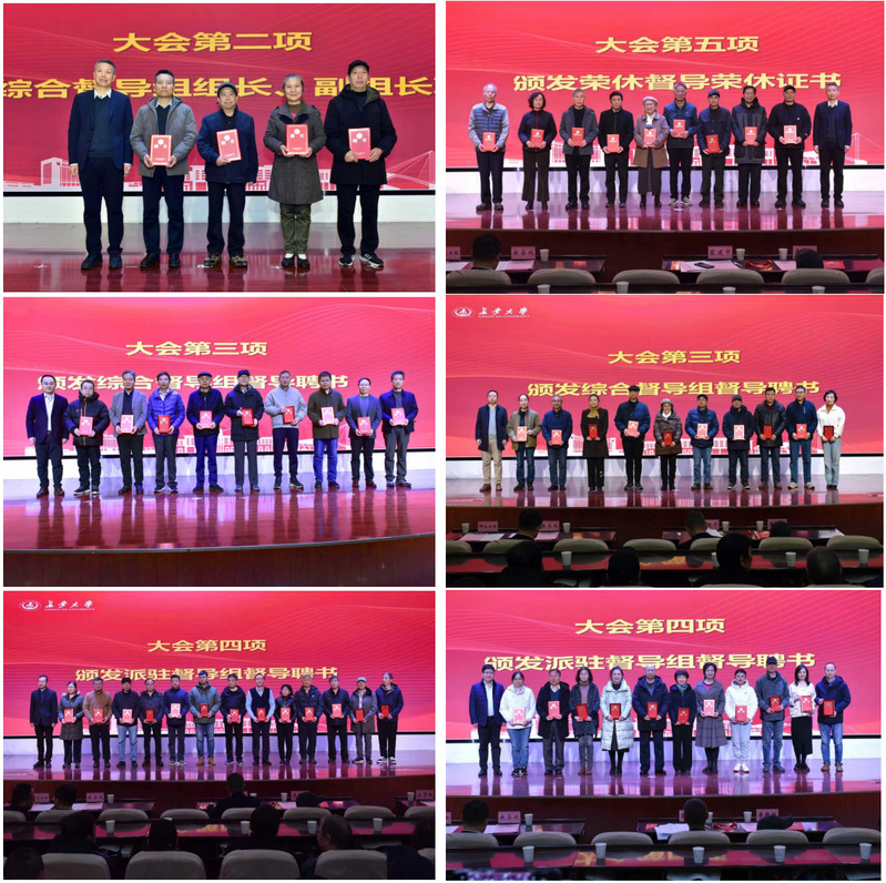 研究生院执行院长王来军宣读了《关于聘任长安大学2025年教育教学督导的决定》。教务处、研究生院、教评中心、实管处负责人分批为新聘综合督导组督导、派驻督导组督导代表颁发聘书。